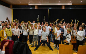 Den Abschluss des gelungenen Abends bildete die Jugendkapelle Grunern-Wettelbrunn-Ballrechten-Dottingen geleitet von Nathalie Viehöver und verstärkt um einige Bläser aus der Bläserklasse 4 der TRS. Linea Fuchs und Cora Kraft sagten die Nummern professionell an und dann war wieder Rockmusik an der Reihe. Beim „We will rock you“ durfte sogar das begeisterte Publikum mitklatschen und mitstampfen.