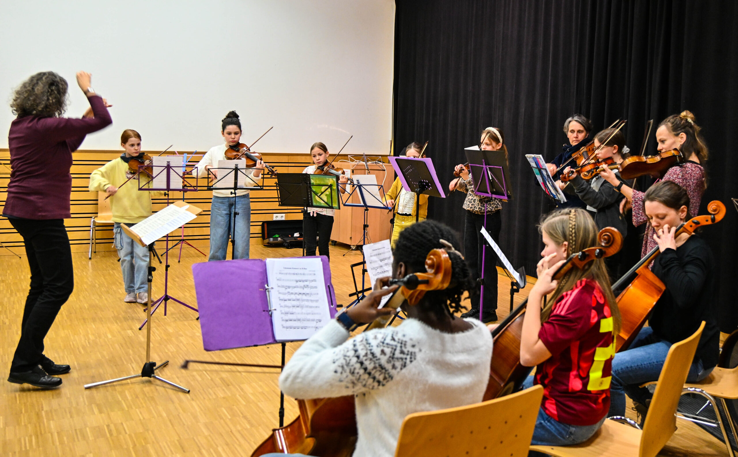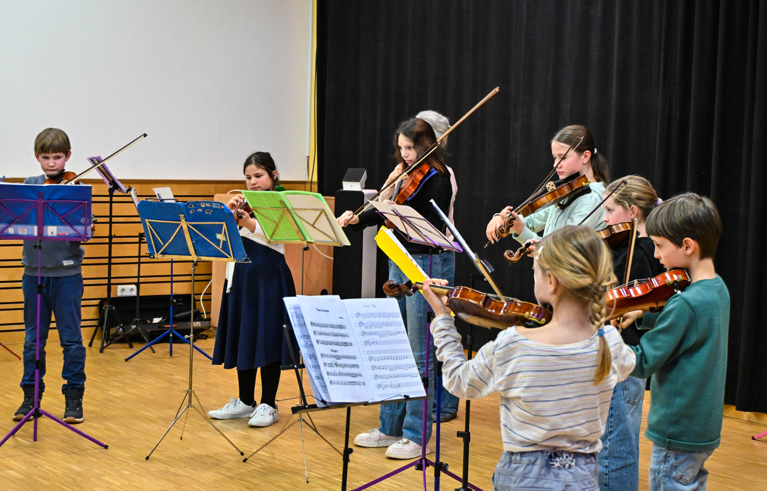 Den Auftakt des bunten Konzertes machte Emma Ernst an der Gitarre, sie überzeugte als Solistin. Das Streicherorchester „Die Tapferen Streicherlein“ für Anfängerinnen und Anfänger besteht seit diesem Schuljahr aus zwei Gruppen, eine in Merzhausen und eine, wie bisher in Staufen beheimatet. Für den Konzertabend hatten sie fusioniert und zeigten, dass sie auch als Anfänger an ihren Streichinstrumenten durchaus als Orchester zusammenspielen können. Die Leitung des Ensembles liegt bei Jeanette Dorée und Marie Desgoutte.