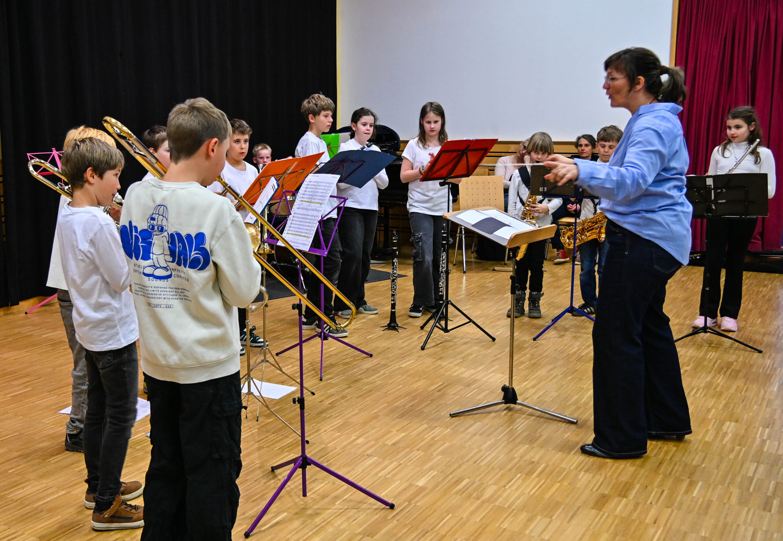 Den Abschluss des gelungenen Abends bildete die Jugendkapelle Grunern-Wettelbrunn-Ballrechten-Dottingen geleitet von Nathalie Viehöver und verstärkt um einige Bläser aus der Bläserklasse 4 der TRS. Linea Fuchs und Cora Kraft sagten die Nummern professionell an und dann war wieder Rockmusik an der Reihe. Beim „We will rock you“ durfte sogar das begeisterte Publikum mitklatschen und mitstampfen.